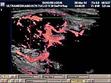 (3D CPA) Trodimenzionalna obrada krvnih sudova prethodno prikazanih Color Power (3D CPA) modom je tehnika koja omogućava razlikovanje normalnih krvnih sudova od patoloških kao što je to u tumorima. I ovde se mora napomenuti da je preciznost ove 3D CPA tehnike veća jer je i CPA mod ima znatno veću osetljivost nego kod drugih aparata. |