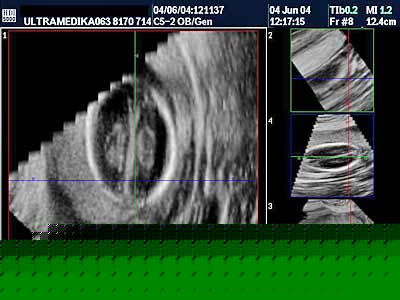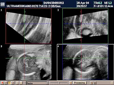 markeri uoče: 1. Ugao ulaznog ultrazvučnog talasa i osovine kostiju nosa ploda moraju zauzimati ugao od 45 stepeni da ne bi došlo do lažnog skraćenja ili odsustva nosnih kostiju (NB). 2. Anehogena rskavica izmedju frontalne (čeone) kosti i ehogene kosti nosa takodje omogućava tačno prepoznavanje nosnog grebena. 3. Prenazalna debljina kože –PT se meri izmedju frontonazalnog ugla i spoljne konture kože. 4. Da bi se ovi markeri uočili aparat mora posedovati HD ZOOM (uvećanje slike bez smanjenja njenog kvaliteta) soobzirom da izmeren strukture iznose samo nekoliko mm. 5. Najčešće se meri 2 ili 3 prst jer su oni najčešće ispravljeni, pri čemu se u obzir mora uzeti i meko tkivo prsta. Od ranije se zna da ušiljavanje zadnje falange prsta (klinodaktilija ) kao i odsustvo medijalne kosti petog prsta tj. njegovog ukupnog skraćenja takodje predstavljaju markere za DSy. Ovi ultrazvučni markeri su prisutni u ranom II trimestru (16gn). Medjutim ako postoje linearne sonde od 12 MHz moguće je ove markere uočiti i u I trimestru. Zbog različite veličine ovih struktura u zavisnosti od starosti trudnoće uobzir se uzimaju odnosi PT/N kao i odnos dužine prasta sa širinom šake. Senzitivnost ovih markera je oko 76% uz 6,7% lažnog pozitivnog nalaza. |