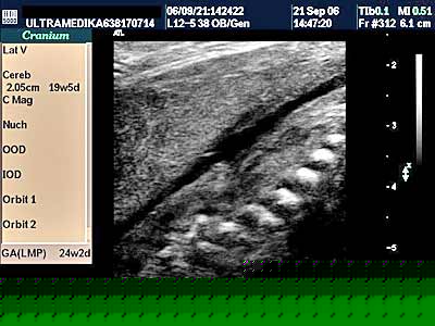 stuba ploda. Zaključak Defekt u formiranju neuralne cevi ploda spada u najčešće anomalije. Ova sumnja na postojanje spine bifide (mijelomeningokele) se može postaviti analizom krvi trudnice tj odstupanjem vrednosti alfa feto proteina od srednje vrednosti. Definitivna dijagnoza je moguća ekspertnim ultrazvukom u 100% . Prognostički značaj postoji u zavisnosti od visine lezije na kičmi. Magnetna rezonanca ne dovodi do novih podataka ako ultrazvčni pregled zbog nečega nije kompletan. Ultrazvučna dijagnostika može otkriti ovu anomaliju u I i ranom II trimestru. U toku trudnoće ultrazvučni nalaz se može menjati, te je nekad lakše postaviti dijagnozu u ranijoj trudnoći a redje u kasnijoj. |